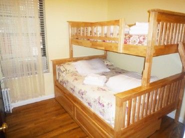 The apartment sleeps 8 in beds and 9 if someone sleeps on the foldaway in the living room. We can also provide a foldaway bed. The layout is wonderful for two couples also as the bedrooms are on opposite ends of the apartment with the bath in the middle. The Master bedroom has a queen. The second bedroom has a full. The third bedroom has a full, twin trundle and bunk.